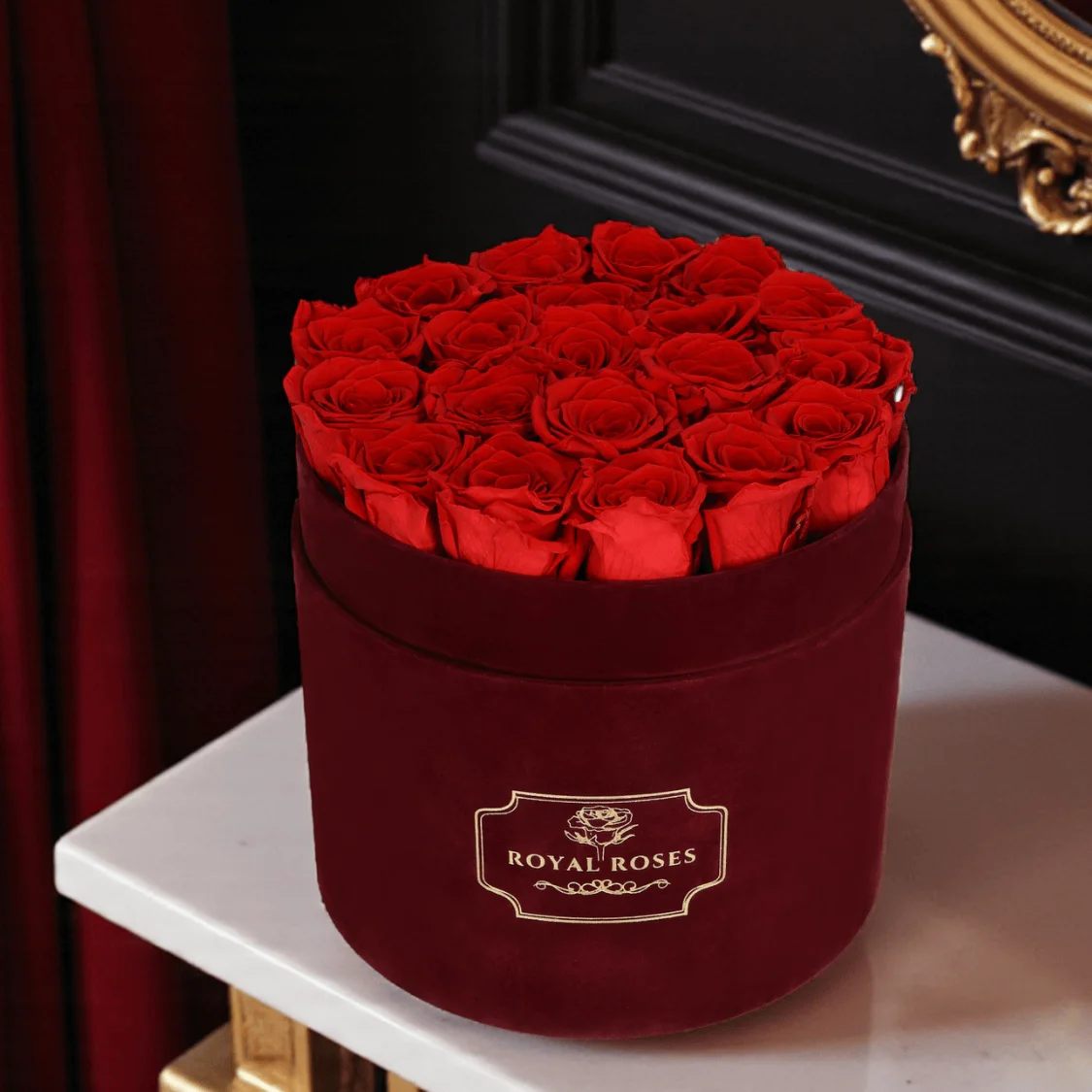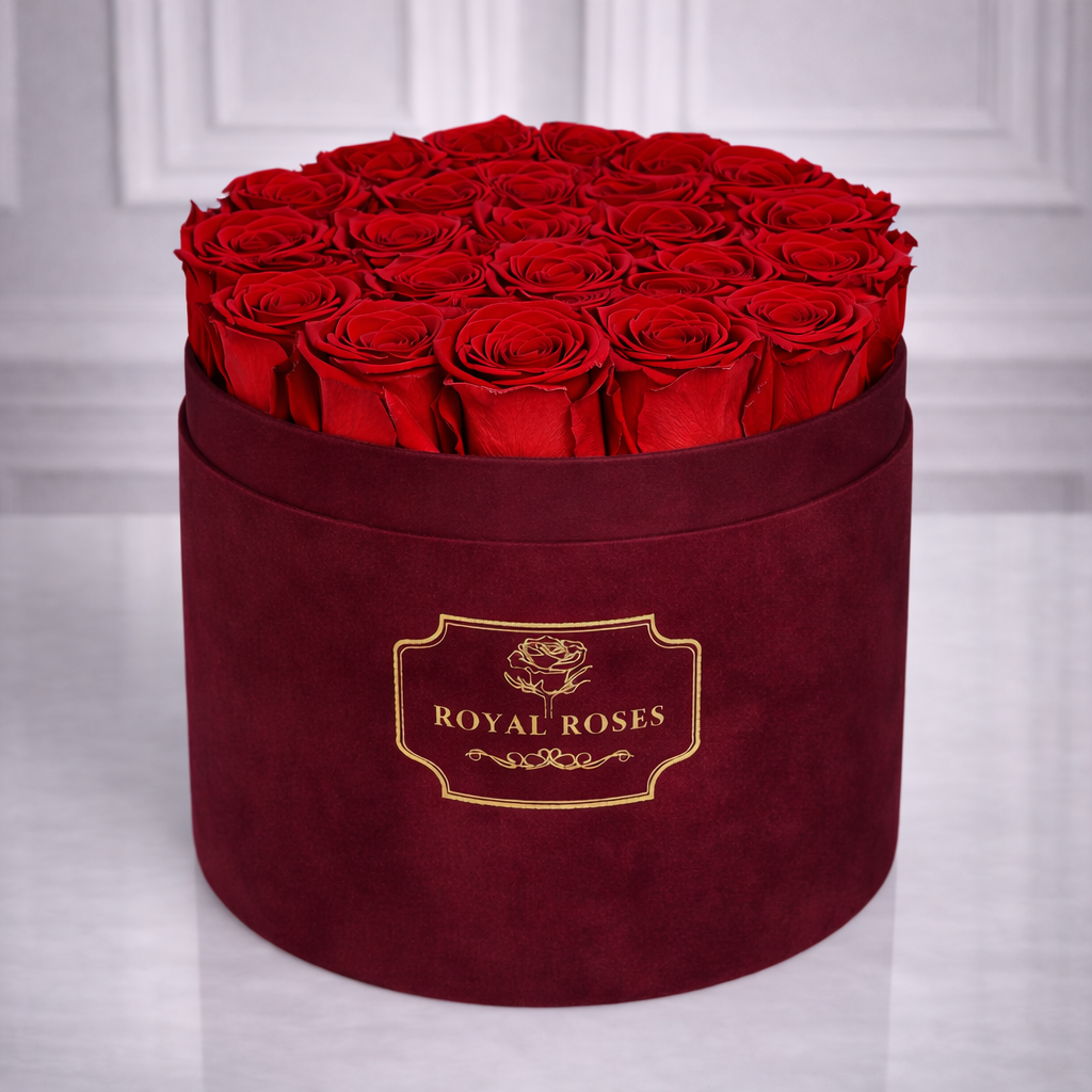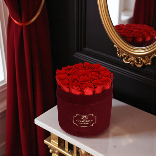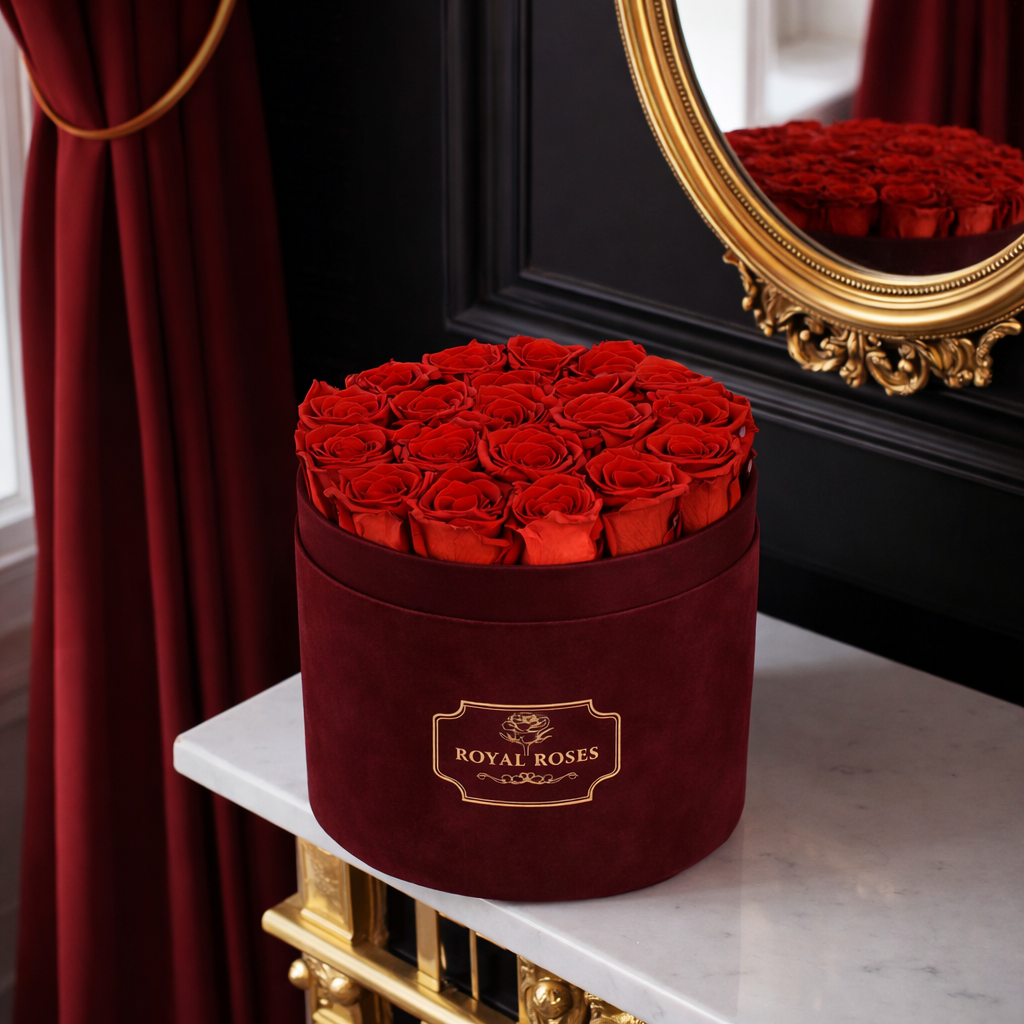Minimalistyczna kompozycja z wiecznych róż w bordowym pudełku, dla osób, które cenią elegancję i wyjątkową jakość w ważnych momentach.
